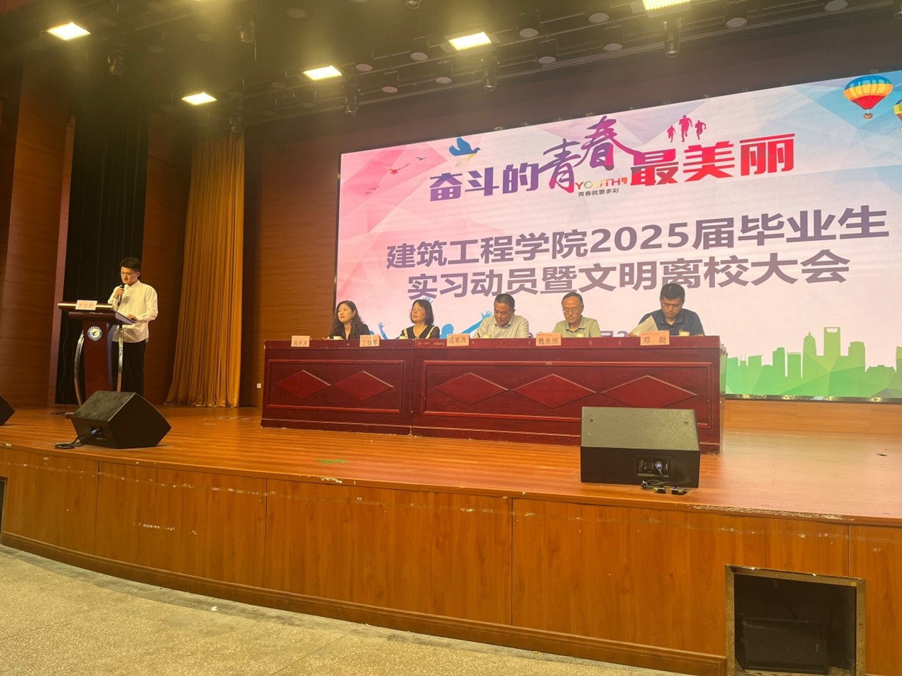 随后,副院长邓勋对学院2025届学生顶岗实习时间、实习形式、实习过程管理、实习考核与成绩评定等方面作了具体布置和要求。魏永恒对即将进入顶岗实习的同学们作总体要求:第一要勤学勤问,认真学习实践知识;第二要注意纪律,遵守实习现场的规章制度;第三要确保安全,提高自身的风险防范意识。党总支副书记施芳芳要求全体同学做好文明离校工作。22建工2班王政同学代表全体实习生发言。