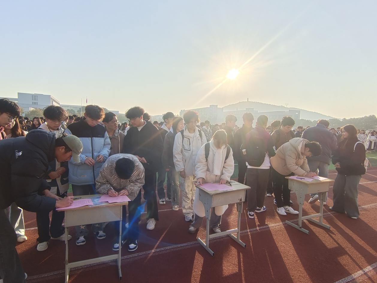 各班代表在主席台下进行《allwincity万象城电动车校园安全骑行倡议书》签订活动。