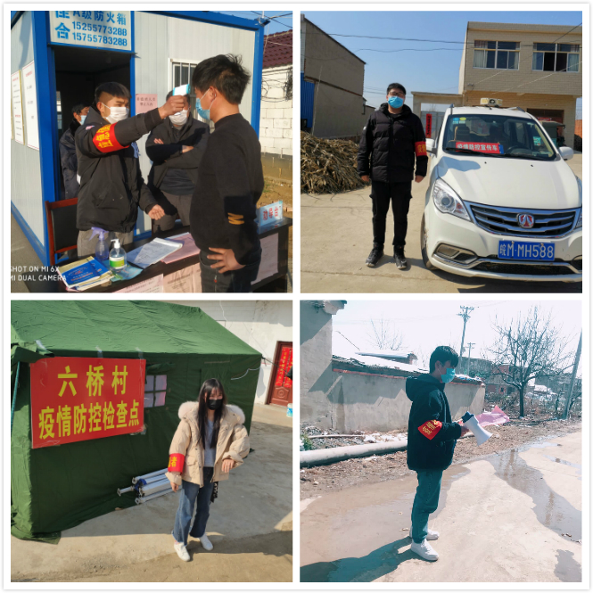 18环艺班李学明,在阜阳市颍上县建颖乡丁楼村服务点担任志愿者,主要任务是宣传疫情防控、驱散聚集人群;19建工3班那飞跃,在宿州市泗县屏山镇韩庄服务点担任志愿者,主要任务是出入口人员及车辆登记和测体温;19建工5班刘宏亮,在明光市涧溪镇苏郢村服务点担任志愿者,主要任务是车辆出入登记和消毒;19建装班万素琴,在芜湖县红杨镇刘桥村服务点担任志愿者,主要任务是劝返外来人员和车辆……