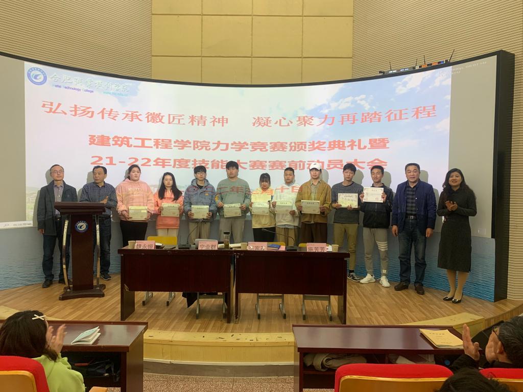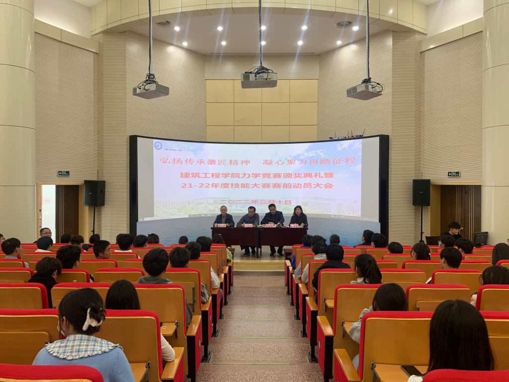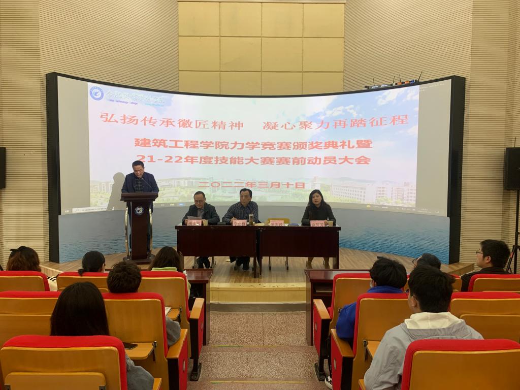 为大力弘扬传承徽匠精神,不断完善和创新“立足校企融合,传承徽匠精神的建筑类专业特色人才培养”,鼓励和表彰我院在安徽省大学生力学竞赛中获奖的同学及指导教师,为积极备战省校技能大赛的同学及指导教师加油鼓劲,3月10下午,allwincity万象城在鼓山校区图书馆二楼报告厅举行安徽省大学生力学竞赛颁奖典礼暨2021-2022年度安徽省职业院校高职组技能大赛赛前动员会。