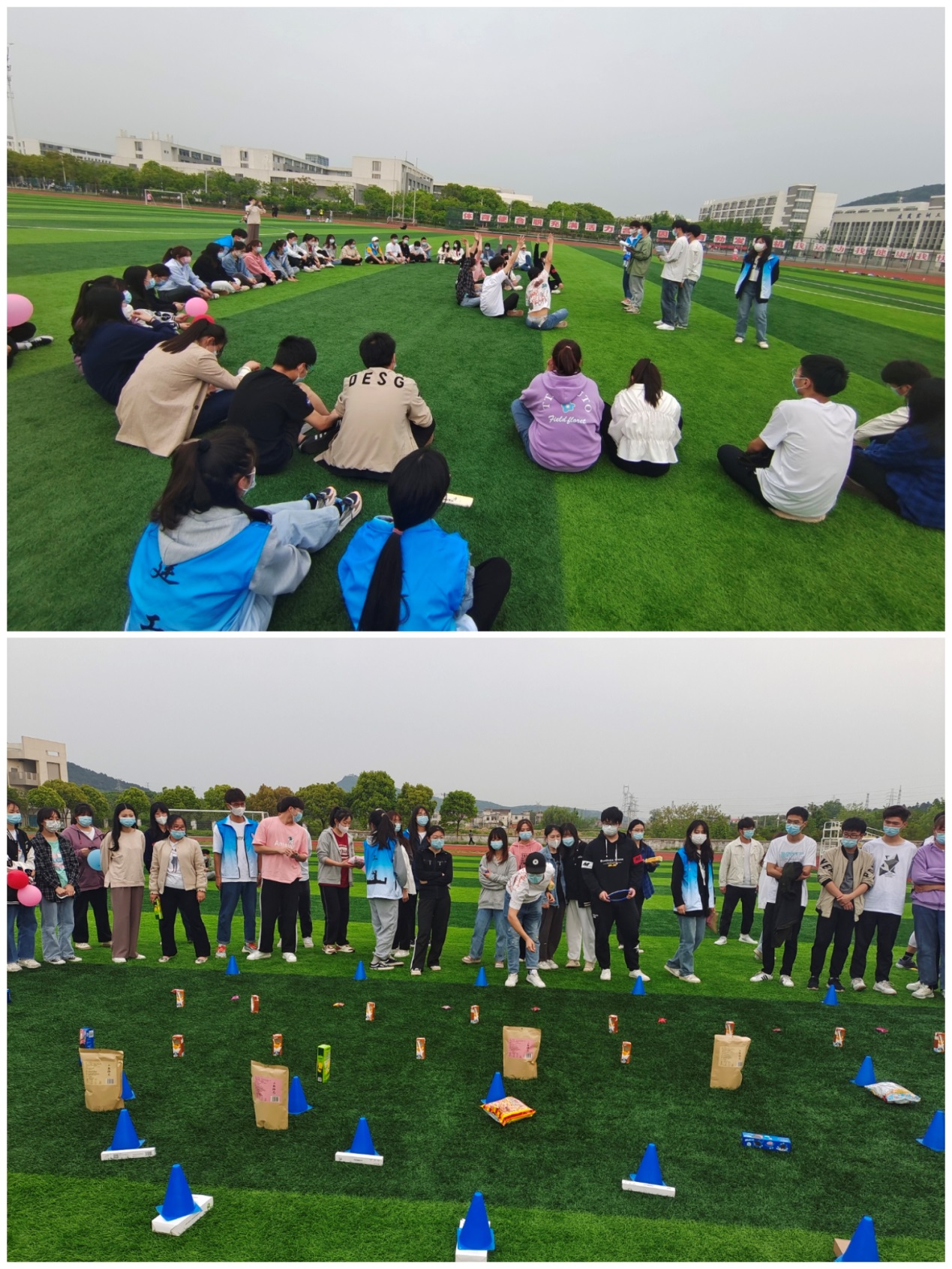 4月15日下午4点,第一期活动在鼓山校区室外运动场准时开始。团体游戏井字棋、摸石头过河、撕名牌依次开展,同学们为了小组的胜利相互协作,奋力争先,活动现场充满了欢呼声和加油声。在撕名牌环节,同学们在名牌上写下了“不戴口罩”、“串宿舍”、“点外卖”等不符合校园疫情防控举措的不文明行为,以撕下名牌的方式表达拒绝这些不文明行为的态度,遵纪守规,共同维护校园疫情防控安全。