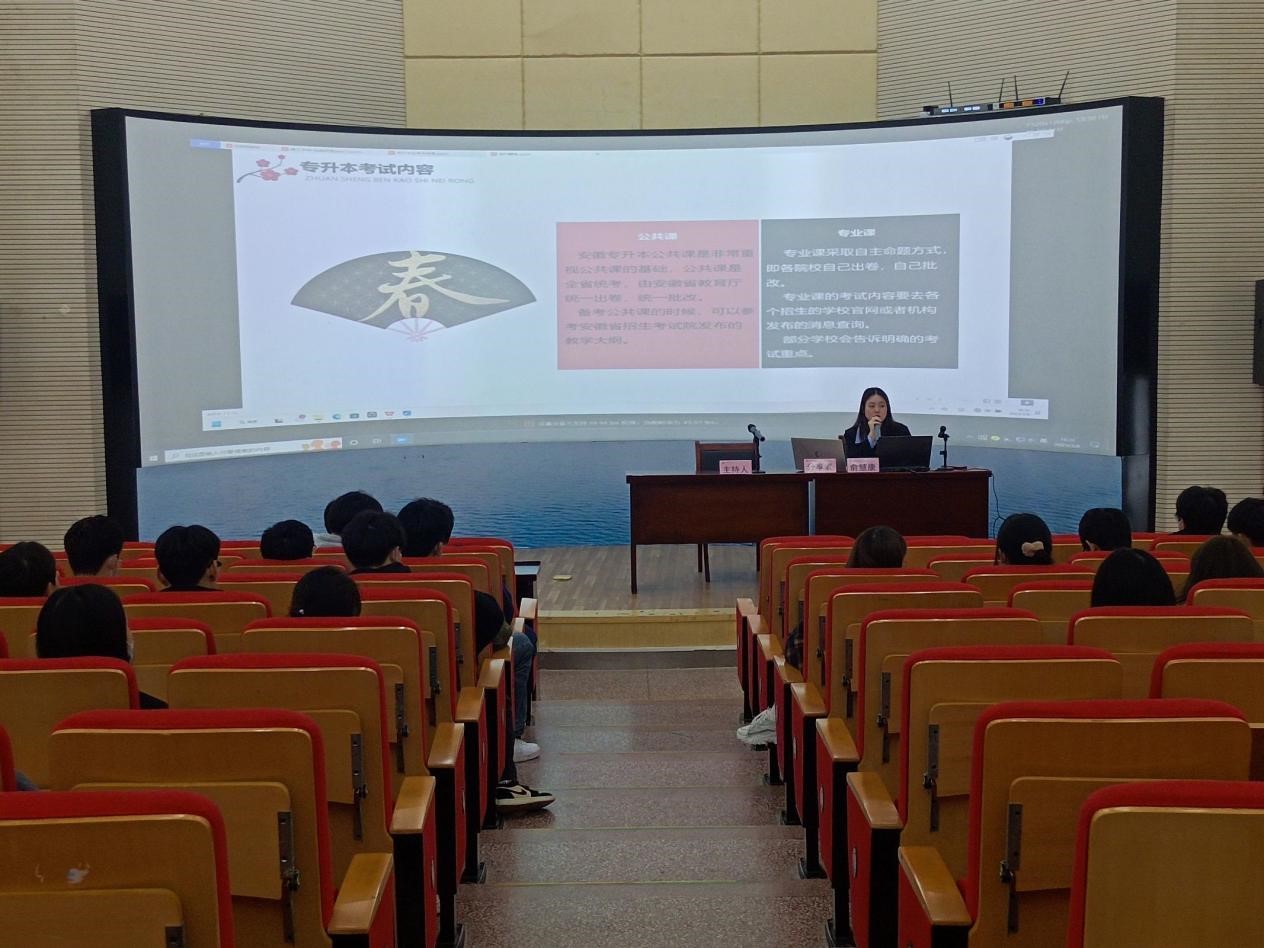 两位同学结合自己的备考经历,从专升本的考试内容、学习方法、阶段性任务、报考学校和专业的选择等多个方面和参会同学做了无私的分享。他们质朴、真诚的话语赢得了同学们一阵阵的掌声,活动现场气氛轻松,台上台下互动热烈。尤其在谈到报考学校的选择时,两位同学说,身为合职学子,深深爱着合职,当初报考时看到有回到母校再学习的机会真的是毫不犹豫又一次选择了合职。如今,看着学弟学妹们也在朝着自己的梦想努力向前,一定要为大家加油打气、助力鼓劲。