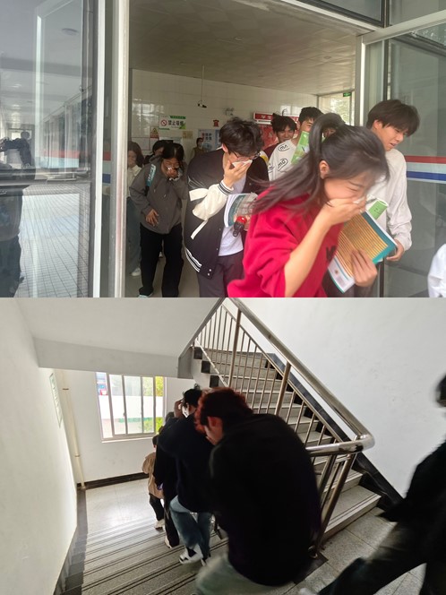本次演练分为两个部分,分别在男生宿舍6号楼和教学楼C栋进行。下午3点40分,随着火灾发生信号的响起,逃生演练正式开始。在宿舍区域,演练模拟了人员密集场所火灾发生的紧急情况,学生们在宿管人员和志愿者的指导下,迅速有序地进行了疏散。在教学楼区域,则模拟了白天上课期间的火灾情景,负责老师在第一时间到达所在楼层指挥疏散学生,学生们听到火灾发生信号后,捂住口鼻,弯腰贴墙按照指定路线开始有序疏散。在老师们的指挥下,各班学生安全迅速地撤离到教学楼前方广场的安全地带,师生共同参与了逃生演练。