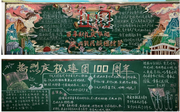 活动的第三部分是绘制“弘扬五四精神 共庆建团百年”主题黑板报,同学们用粉笔在黑板上描绘书写新时代青年对“五四”精神的理解和传承:“忧国忧民的爱国主义精神、无私奉献的社会责任感、民主科学的进步精神”。如今,以“爱国、进步、民主、科学”为核心内容的五四精神火炬已经传到我们手中,让我们一起共筑强国梦,青春勇担当!